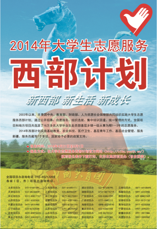 关于2014年度全国大学生志愿服务西部计划启动的预告暨进行网上报名的通知 发布时间:2017-08-21 作者: 浏览次数:次 系属各2014届毕业生: 2014年度全国大学生志愿服务西部计划已经启动,报名时间为4月21日—6月1日。凡我系2014年应届毕业生均可参加报名,报名学生直接登陆西部计划网站//xibu.youth.cn/查看相关文件、政策精神,进行网上注册、报名(填写报名报并下载打印)。目前相关文件还没有下发,具体选拔工作流程没有确定。 相关动态,请关注西部计划网站,请各毕业生相互告知。 特此预告。 附件1:2014大学生志愿服务西部计划海报 附件2:2014年西部计划报名注册图解(详见大学生志愿服务西部计划网站,网址://xibu.youth.cn/ggl/201404/t20140418_5047247.htm) 数学系团总支 二○一四年五月八日