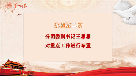 会议第二项,由团委副书记王思思对当前重点工作进行布置。王思思强调了“劳动教育”的具体改进细则,“六进公寓”活动的优化规划以及“部门素拓”具体要求等,使全体干部更加明确重点工作任务与工作要求,更好地履职尽责。