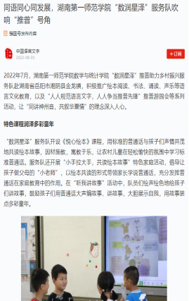 团队以寓教于乐的形式开展乡村地区语言文字工作,努力弘扬中华优秀传统文化,让童音同语、红色经典浸润乡村。团队的系列推普活动的得到了国家级省级媒体的大力宣传报道获得了较好的社会反响。