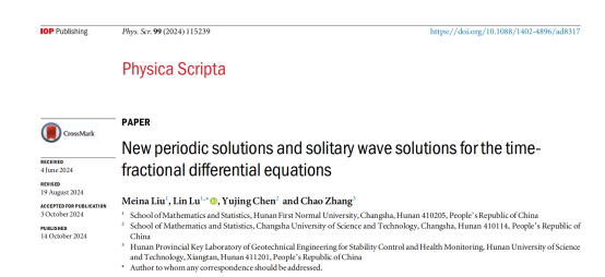 学生刘美娜在卢霖博士指导下,与湖南科技大学张超博士、长沙理工大学硕士陈玉晶合作,在数学物理领域国际学术期刊《Physica Scripta》发表了题为“New periodic solutions and solitary wave solutions for the timefractional differential equations”的学术论文。69堂
