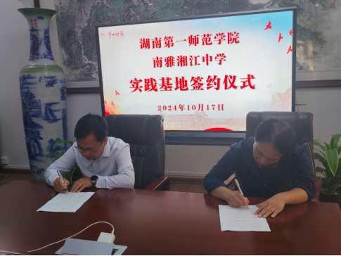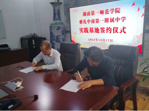 与雅礼中南第一附属中学、南雅湘江中学实践基地签约仪式在学院一楼会议室举行。学院党委书记曾玉华、副院长王增赟、部分教师代表以及雅礼中南第一附属中学校长虢志宇、南雅湘江中学校长唐军出席签约仪式。