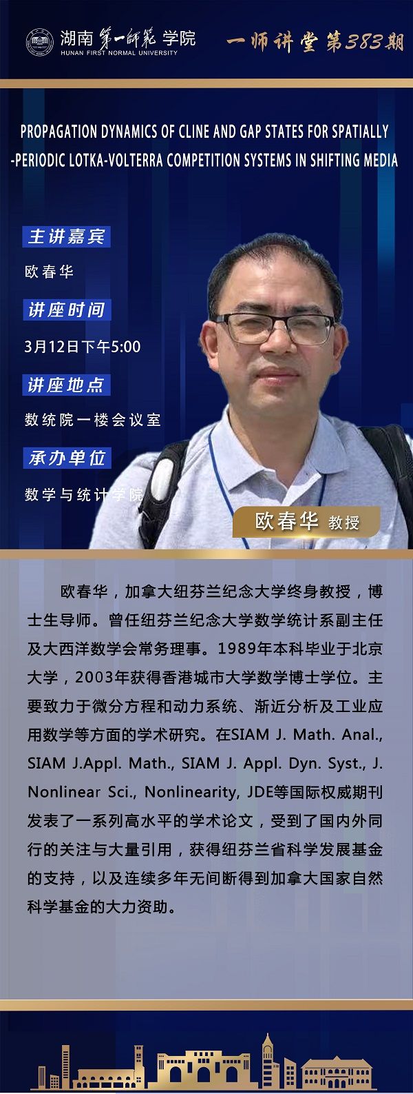学术报告|数学高峰讲坛第56期:Propagation Dynamics of Cline and Gap States for Spatially-periodic Lotka-Volterra Competition Systems in Shifting Media 发布时间:2025-03-10 作者: 浏览次数:次