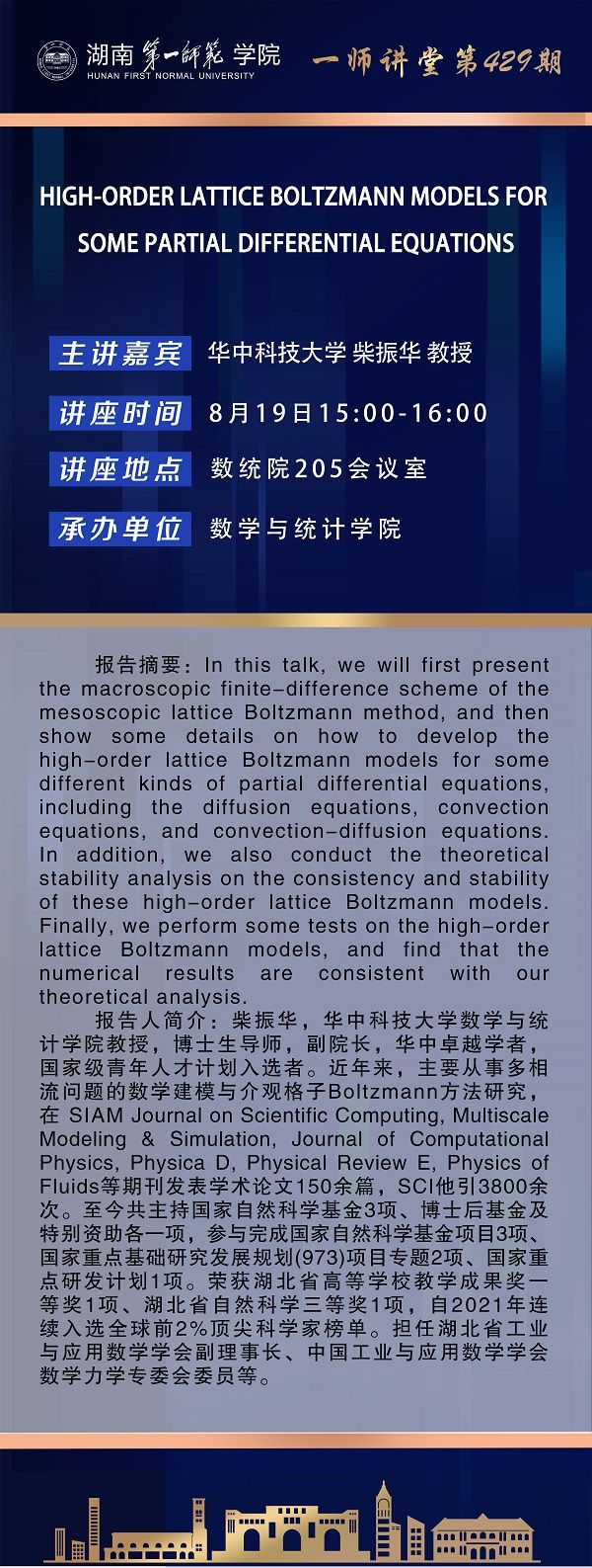 学术报告|数学高峰讲坛第70期:High-order lattice Boltzmann models for some partial differential equations 发布时间:2025-08-17 作者: 浏览次数:次