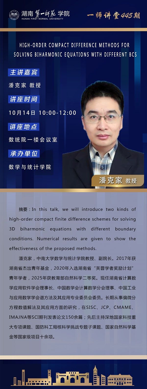 学术报告|数学高峰讲坛第74期:High-order compact difference methods for solving biharmonic equations with different BCs 发布时间:2025-10-13 作者: 浏览次数:次