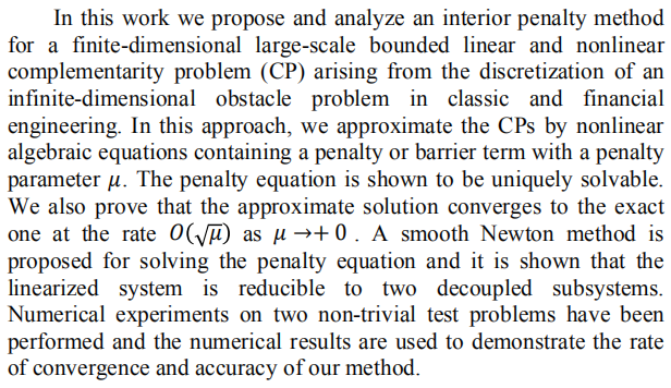 报告题目:Interior penalty method for finite-dimensional complementarity problems in Financial Engineering