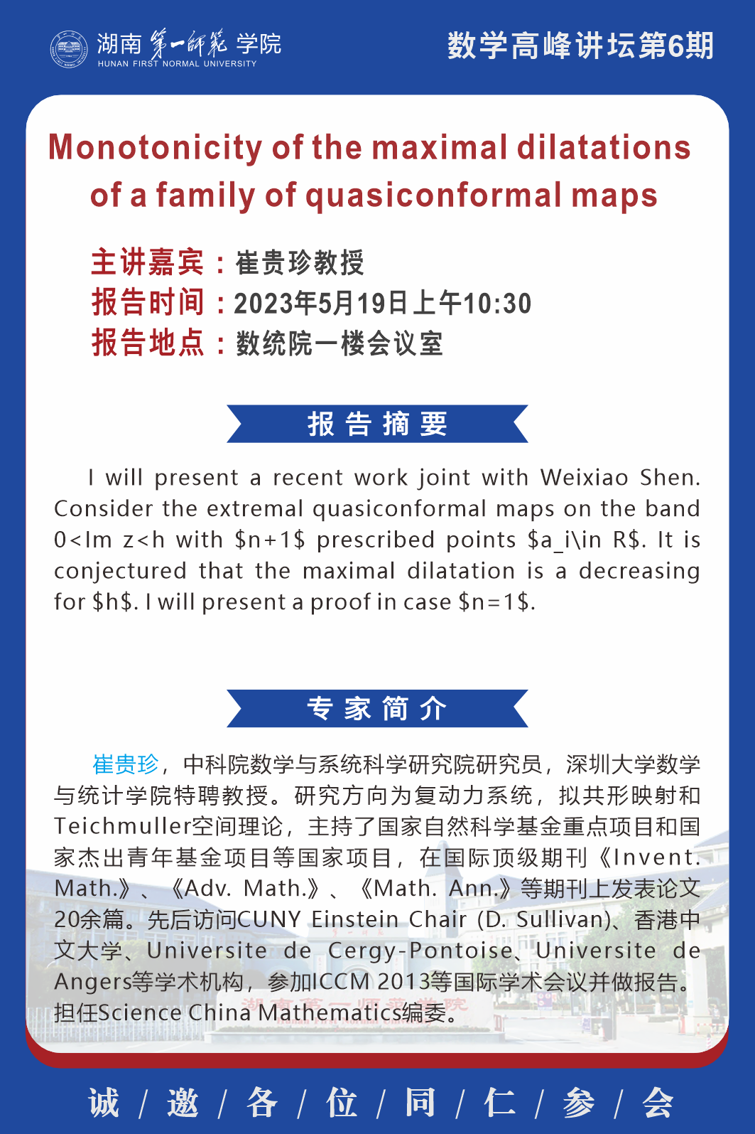 学术报告|数学高峰讲坛第6期:Monotonicity of the maximal dilatations of a family of quasiconformal maps 发布时间:2023-05-17 作者: 浏览次数:次