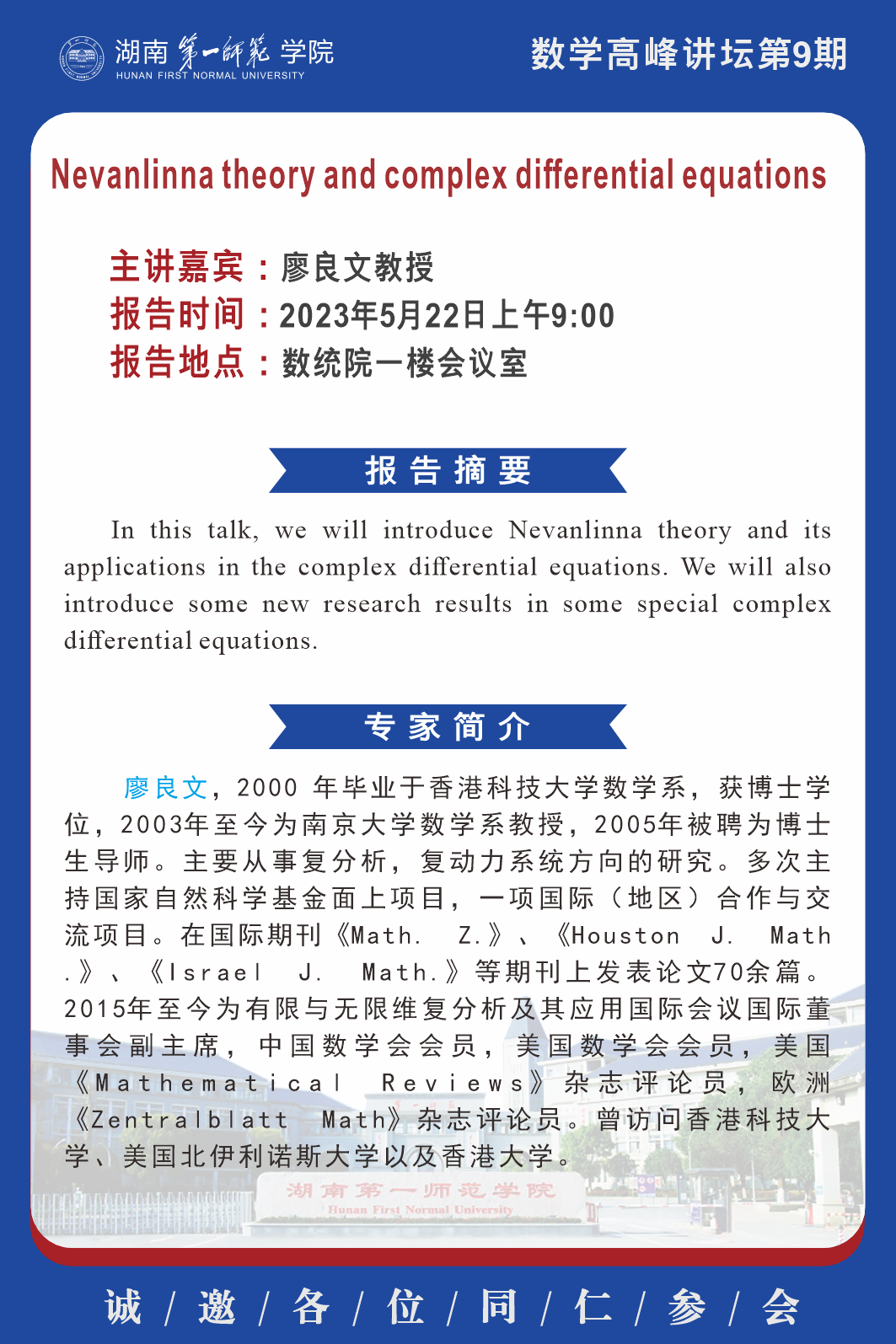 学术报告|数学高峰讲坛第9期:Nevanlinna theory and complex differential equations