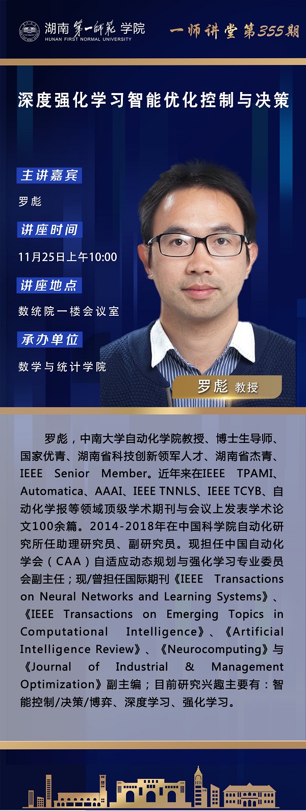 学术报告|数学高峰讲坛第51期:深度强化学习智能优化控制与决策