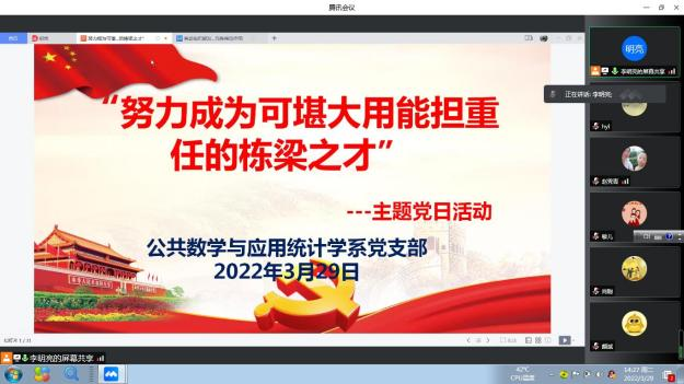 3月29日下午,公共数学与应用统计学系党支部在线上开展“努力成为可堪大用能担重任的栋梁之材”主题党日活动,学院党委书记曾玉华和支部全体党员参加,活动由党支部书记李明亮主持。