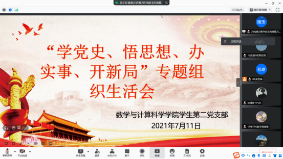 学生第二党支部于7月11日组织开展了“学党史、悟思想、办实事、开新局”的专题组织生活会。会议由学生第二党支部书记杨晗主持,学生第二党支部全体同志参会。