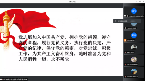 在重温入党誓词后,支部书记杨晗代表党支部委员会对学生第二党支部2021年上学期组织活动开展情况进行总结,特别是党史学习教育情况。
