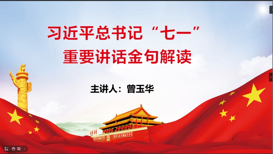 党总支书记曾玉华书记为小教教研室支部全体党员对习近平总书记“七一”重要讲话金句进行解读,解读了“江山就是人民、人民就是江山,打江山、守江山,守的是人民的心。中国共产党根基在人民、血脉在人民、力量在人民。”,“任何想把中国共产党同中国人民分割开来、对立起来的企图,都是绝不会得逞的!9500多万中国共产党人不答应!14亿多中国人民也不答应!”等金句,句句铿锵有力,掷地有声,振奋人心。