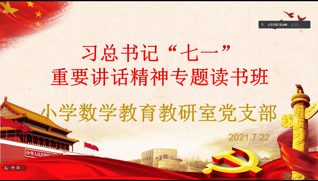 党总支的安排,7月22日下午,小学数学教育教研室党支部全体党员通过腾讯会议开展线上学习习近平总书记“七一”重要讲话专题读书班和专题组织生活会活动,会议由党支部书记赵清贵主持。