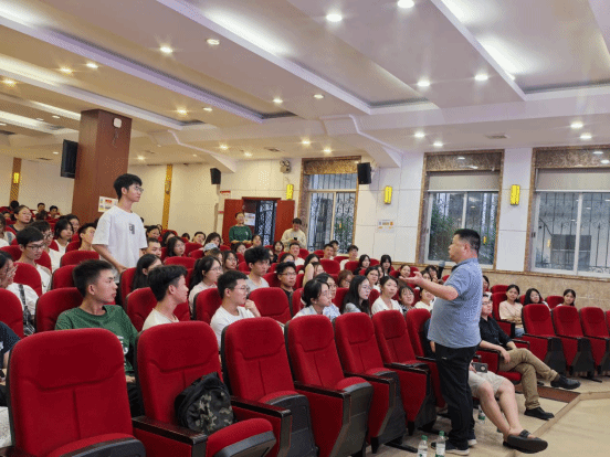 交流环节将现场氛围推向高潮。杨旭光与新生班主任团队——张更容老师、何孝凯老师、刘妍琼老师、陈星老师、何艳丽老师来到学生中间,系统回答“专业学习方法”“职业发展路径”“科研实践机会”等同学们关切的问题。老师们结合自身经验,以真诚的态度、专业的解答消解了新生的迷茫;新生辅导员全程陪伴,细心观察每一位同学的状态,主动与大家交流互动;现场学子积极举手提问,或好奇、或深思的提问声此起彼伏,展现出对专业学习的饱满热情与主动探索的青春姿态。问答之间,师生距离悄然拉近,求知的火花在交流中不断迸发。