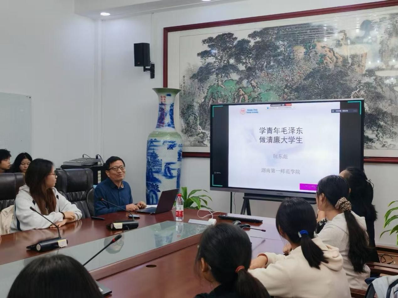 党委书记阮东彪主讲《学青年毛泽东,做清廉大学生》的廉洁专题讲座。69堂