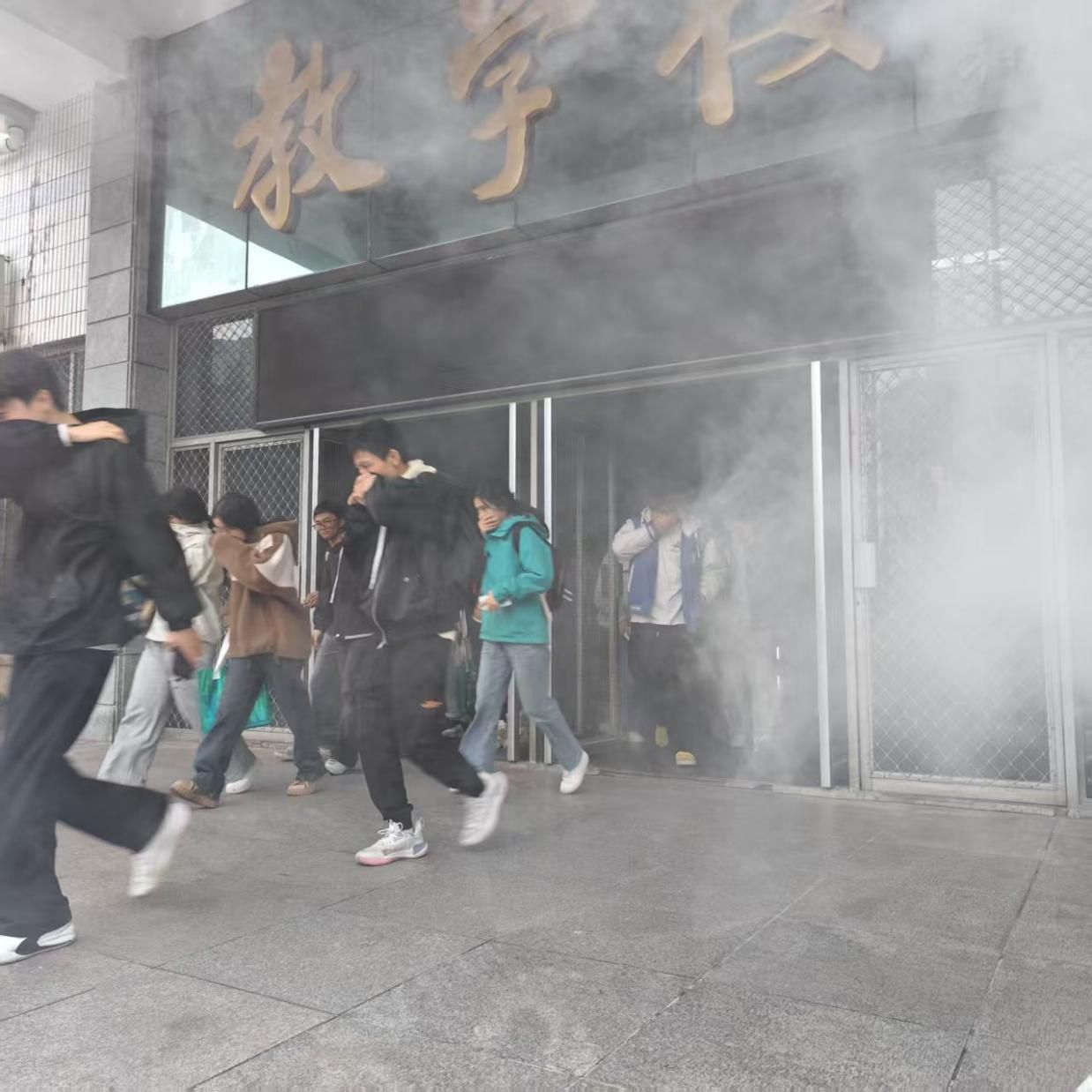 培训结束后,实战演练随即展开。模拟火灾现场烟雾弥漫,警报响起,师生在保卫部工作人员和学院老师的引导下,迅速用湿毛巾捂住口鼻,弯腰低姿,沿指定疏散路线有序撤离至操场安全区域。抵达集合点后,各班负责人快速清点人数并向现场指挥老师汇报。整个演练过程组织严密、响应迅速,有效强化了师生在真实火场中的应急逃生能力。