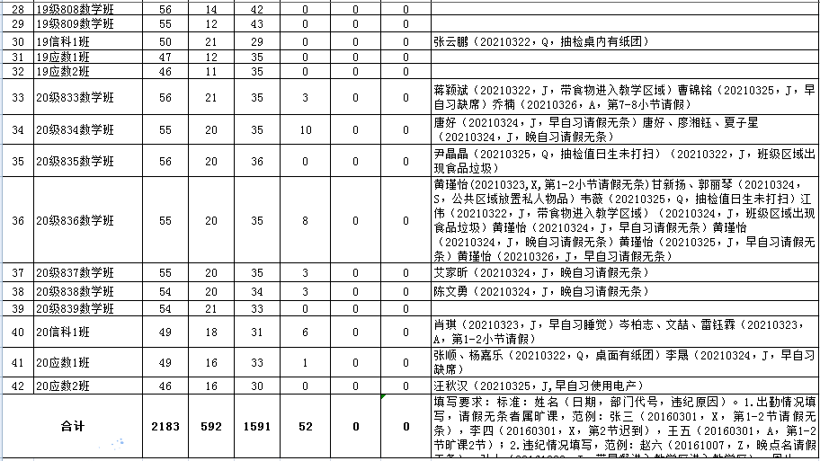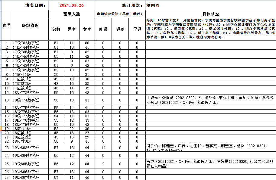 数学与计算科学学院2020-2021学年第二学期第四周考勤表