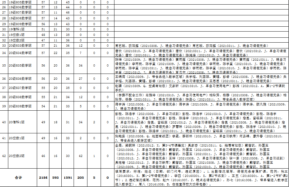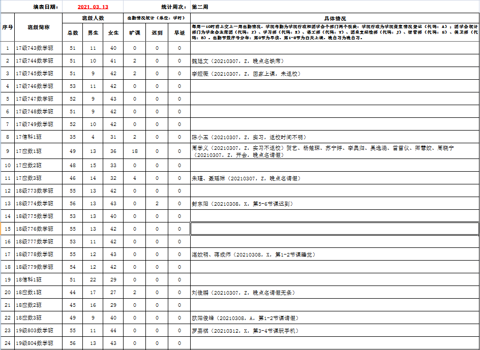 数学与计算科学学院2020-2021学年第二学期第二周考勤表