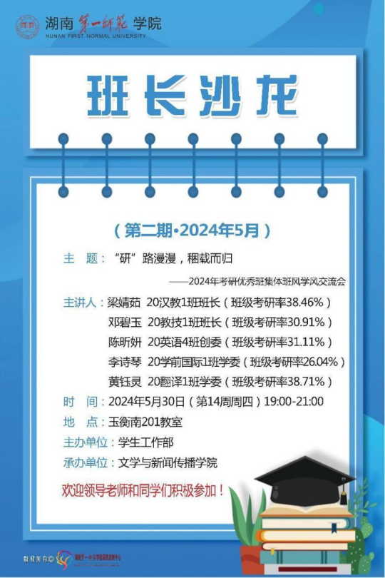 第二期班长沙龙 发布时间:2024-05-29 作者:蒋洁 浏览次数:次 由文学与新闻传播学院承办的第二期班长沙龙将于明天5月30日(周四)晚19:00-21:00在玉衡南201教室举行。本次沙龙的主题是“‘研’路漫漫,稇载而归——2024年考研优秀班集体班风学风交流会”,主讲人是来自教育学院、外国语学院和文学与新闻传播学院的5位优秀考研学子同时也担任班级的主要班干部。请69堂 2022级各班班长参加(届时提前10分钟到场签到)。 附件【班长沙龙.docx】