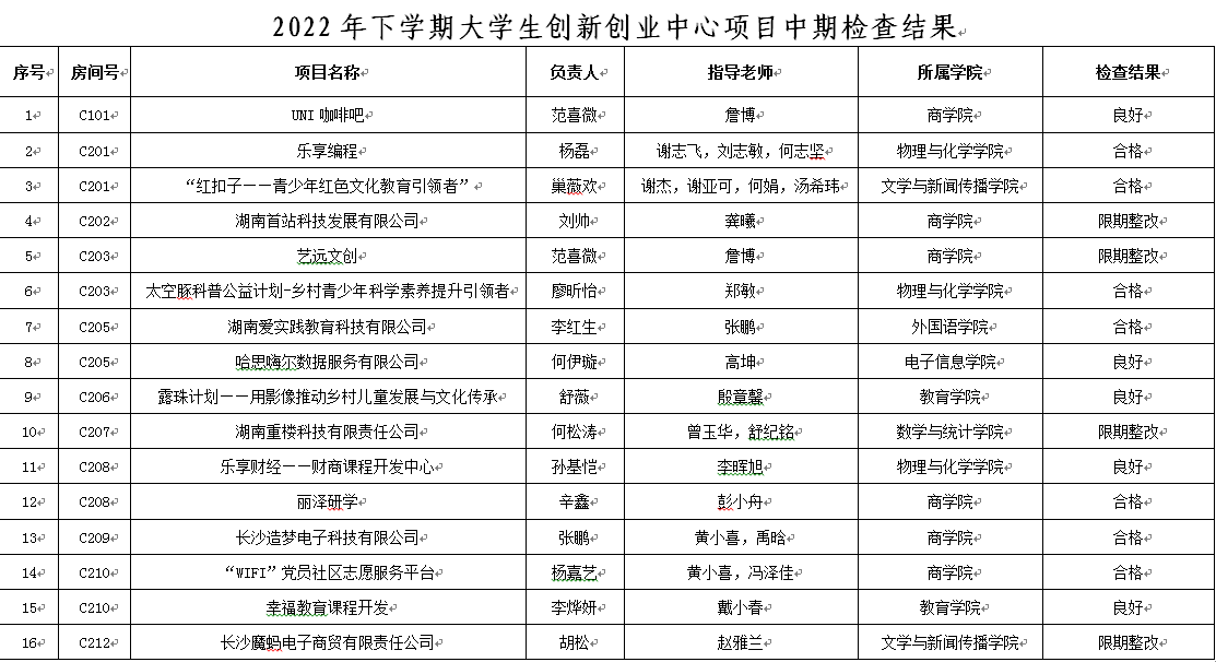 此次参加中期检查的大学生创新创业中心项目共16个,良好项目5个,合格项目7个,限期整改项目4个,详见附件。