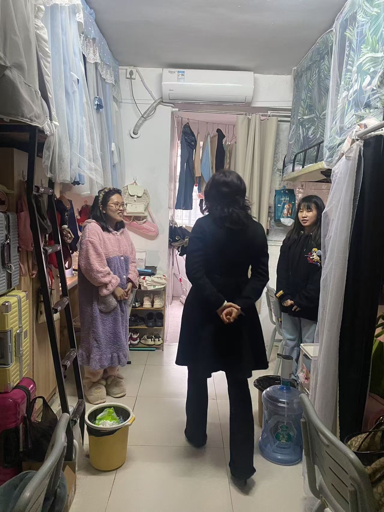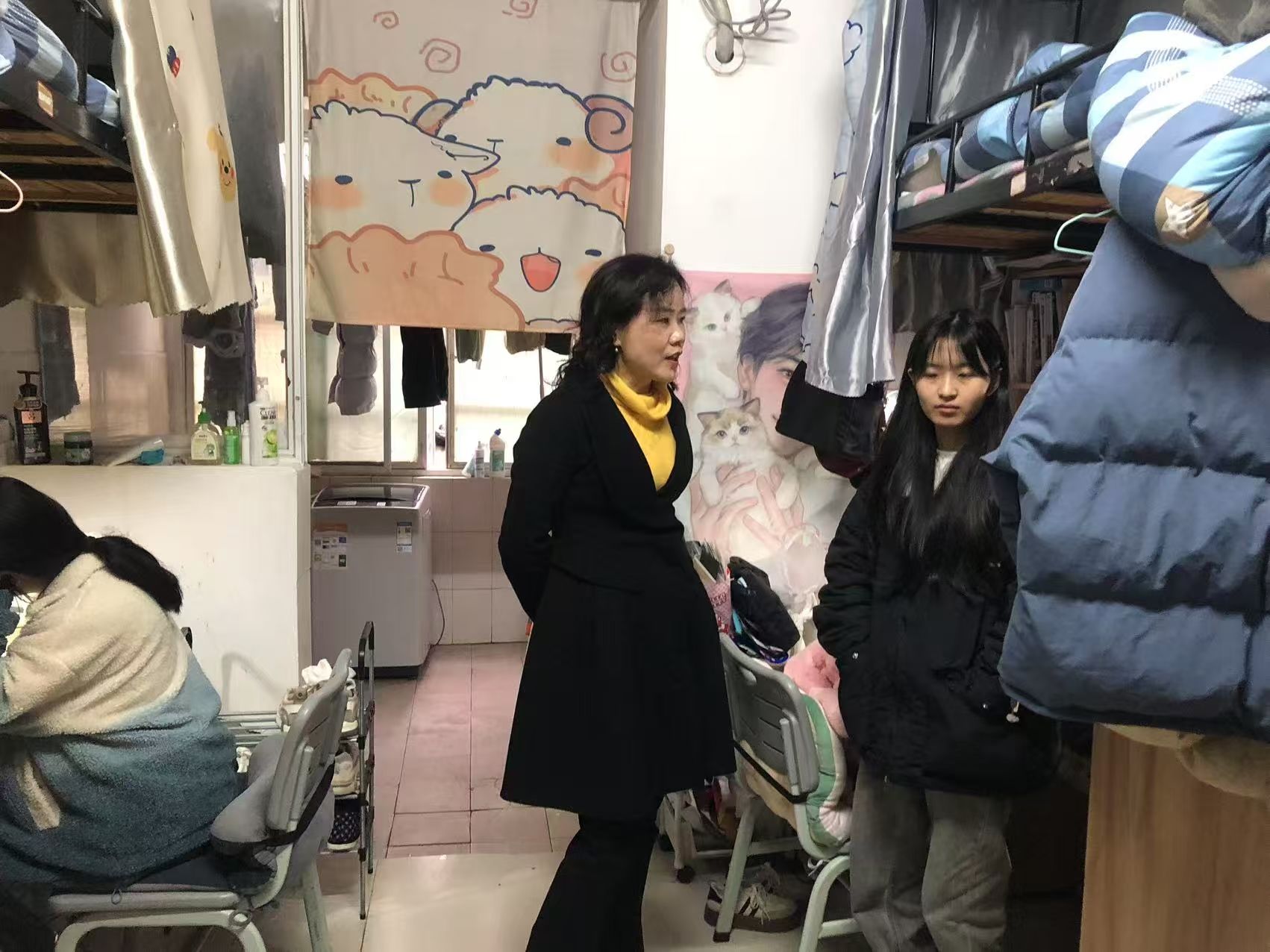 书记下寝 | 隐患排查不松懈,卫生整治在行动 发布时间:2025-03-21 作者: 浏览次数:次 3月21日上午,69堂 副书记申鸣凤带领辅导员走进学生的寝室,仔细检查了宿舍的卫生状况、用电安全、以及违规电器的使用情况。在检查过程中,针对发现的问题现场提出了整改建议,确保宿舍环境的安全与卫生。