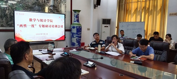 为了全面提升课堂教学水平,切实提高本科人才培养质量,根据学校《关于推进课程“两性一度”建设三年行动计划》的指导意见,及《湘一师通〔2022〕18号关于组织开展2022年本科教学“两性一度”专题研讨培训的通知》要求,7月1日上午,数统院在学院一楼会议室召开“两性一度”专题研讨培训会。教务处处长胡春光莅临指导工作。学院党政领导曾玉华、李雅湘、王增赟、李静出席会议,学院各系室主任及全体教师参加会议。会议由王增赟主持。