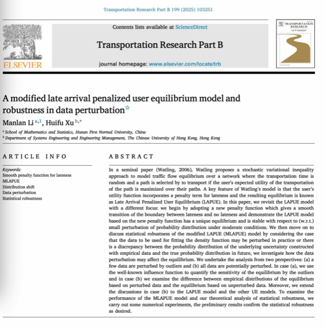教师李满兰与香港中文大学系统工程与工程管理系徐慧福教授合作,在《Transportation Research Part B: Methodological》上发表了题为“A modified late arrival penalized user equilibrium model and robustness in data perturbation”的学术论文。
